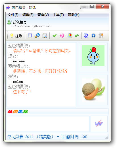 点开上面的小窗口,会出现卡通助手的聊天对话框,它会让您写出单词的拼写,完成拼写后,可以输入“再见”、“88”等常用再见用语来关闭这个画面,继续后续单词学习: