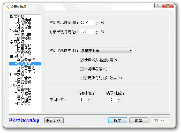可以随意设置小窗口出现的位置、显示效果,以及间隔时间等,还可以设定拼写答题的加减分数: