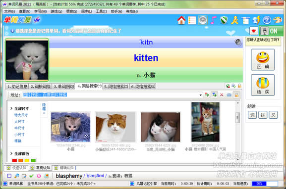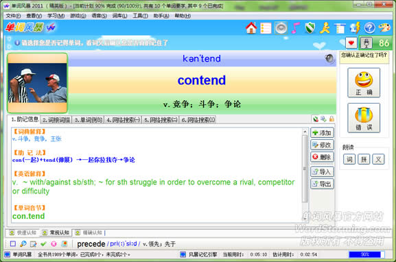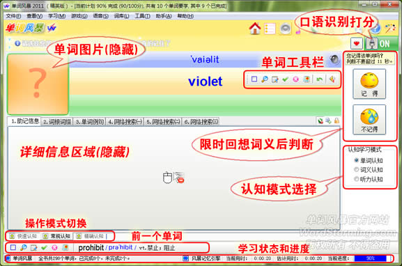 认知风暴——丰富的单词学习手段,深入理解和掌握单词博客介绍:单词风暴之认知风暴,记忆法、图片、词根、例句一个不少!单词风暴的认知风暴智能记忆系统是一个应用遗忘曲线的强大的单词浏览认知学习方法,也是单词风暴免费版里的核心学习系统。简便易用是单词风暴认知风暴智能系统的一大特色,通过认知学习,您可以快速地记忆不认识的单词,同时筛选掉较熟悉的单词。 下图是进入单词风暴认知风暴智能记忆系统的初始画面(常规认知的单词认知模式),先进行回想认知后按“记得”、“不记得”按钮: