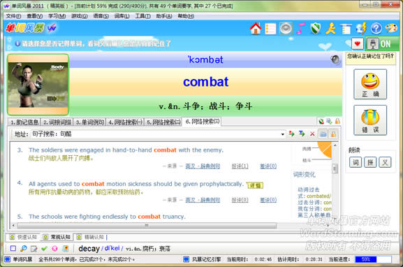 按“记得”按钮后再次确认是否正确记住这个单词,此时可以查看各种助记信息、词根词缀、单词例句、网络搜索等: