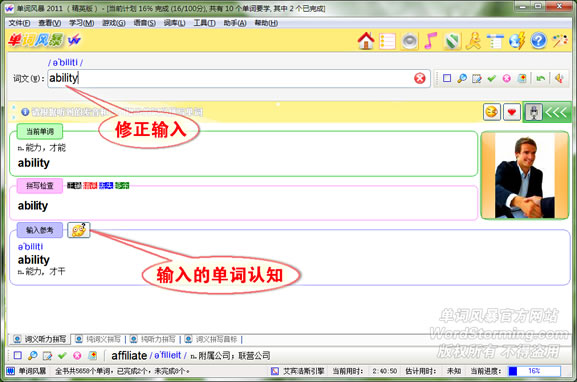 在单词修正的同时可以随时查看输入的单词的参考信息,并进行认知学习: