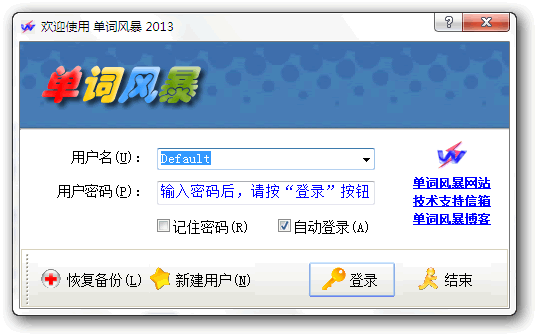 版权申明本文档内容已经过著作权登记。转载时请注明来自于单词风暴官方网站(www.WordStorming.com) | 二、进入主画面运行单词风暴后,如果没有设置自动登录,则会出现用户登录画面,默认用户为“Default”,密码为空,因此直接按“登录”按钮就可以进入主画面了。如果以后不想看到登录画面,可以选择“自动登录”。