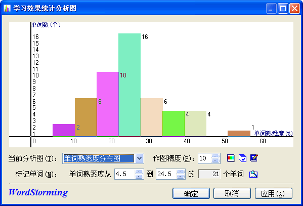 在主画面中点击“学习效果统计分析图”按钮,将显示分析图画面。 在图中单击鼠标左、右键可以选定横坐标的上、下限(如下图:上下限分别为4.5和24.5),可查看/打印该范围内的单词,按“确定”或“应用”键便标记了这些单词。下面又可制定新的学习计划了。注意,这是一个复习用的计划,因此,最好取一个容易区分的计划名,比如计划中含有“复习”字样。