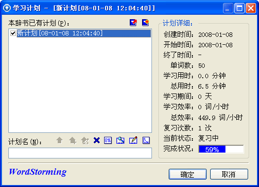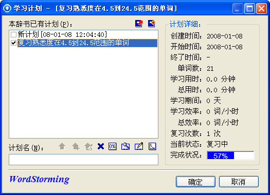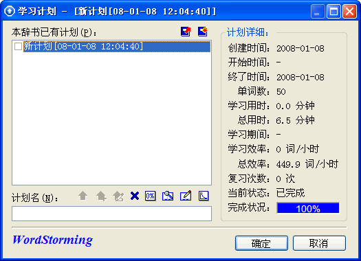 单词风暴能根据已往的学习情况,自动地安排复习时应该完成的分数:累积错误多的单词设定分较高,累积错误少的词设定分较低,很熟的单词甚至只要一次做对便不再出现,提高了复习的效率。 选择一些单词学习直到完成计划,出现“完成计划”画面,点击“完成计划”按钮。打开“学习计划”画面,可以看到该计划已经100%完成,再次标记这个计划,可以看到主画面标题栏中进度不是初始的0%,而是如50%之类的数字。
