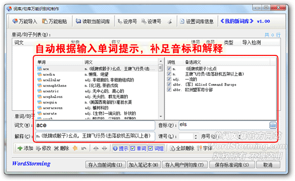 列表中的单词或例句,可以有多种保存方式,可以存入当前词库、加入一本笔记本(包括生词本),作为例句保存,或者保存为标准词库(*.wsdb)文件,方便地将导入的词库或句库用于不同的用途。而且,万能词库制作对于导入的单词给出了导入检测,可以方便地找到导入中的错误并及时修正(点击标题可以排序,便于整体操作)。 万能词库制作制作好单词临时列表以后,有三种保存方式: 1、点“存入笔记本”按钮,可以新建笔记本并存入,也可以存入已有的笔记本或课本,可以学习这个笔记本 2、按“存入”按钮,可以直接保存列表中的单词到当前的词库里继续学习 3、点“保存标准词库”按钮,可以保存到wsbk格式的词库里,需要导入单词风暴图书馆后使用。 推荐1、2方法比较方便。其中方法1适合新建笔记本词库,方法2适合当前词库追加单词,方法3适合制作一个标准词库给别人导入使用。
