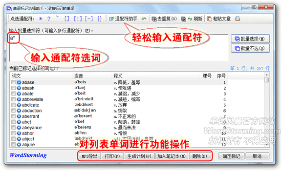 单词标记助手——强大的通配符批量选词功能博客介绍:单词标记助手,背单词软件单词风暴人性化的设计操作单词风暴可以利用星号(*)、问号(?)等通配符号来批量选取具有某些特点的单词,可以对这些单词进行标记、做成学习计划、打印、Mp3导出、删除等操作。十分有利于抽取自己想要的单词来学习。 从主画面点击“单词标记助手”