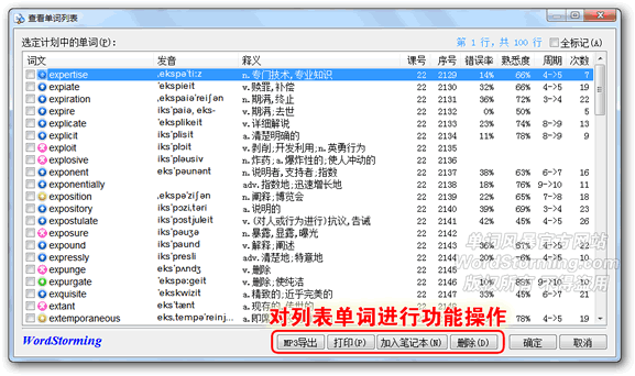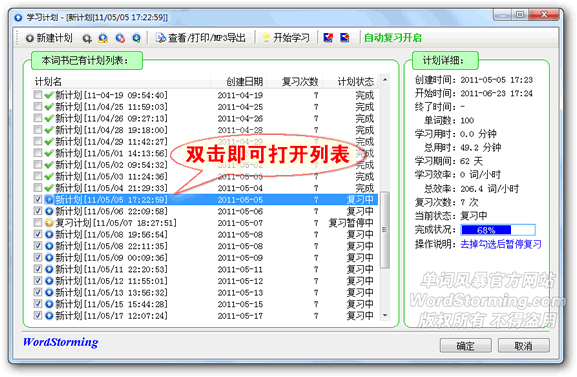 选择了一个计划,就可以看到这个计划的详细信息,包括完成状态,学习进度,开始、终了时间。已经勾选的计划表示正在执行中,没有勾选的,表示该计划目前不在学习,可能是新计划、已经完成的计划或暂停的计划。 因此,想要手动更改学习中的单词很简单,只要修改计划前的勾选状态即可。一般来说,由于默认自动复习是开启的,到了计划的遗忘复习点,系统会自动勾选要复习的计划,因此并不需要您手动来勾选或取消勾选计划,按照系统自动安排的计划学习即可。 双击计划,即可打开单词列表,可以对这个计划的所有单词做Mp3导出、打印、加入笔记本、删除等操作。