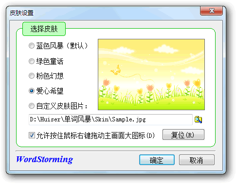 可以选择既定的界面方案,也可以自定义皮肤图片。勾选“允许按住鼠标右键拖动主画面大图标”即可在主画面调整图标位置,使得背景图和按钮大图标完美搭配,更具美感。
